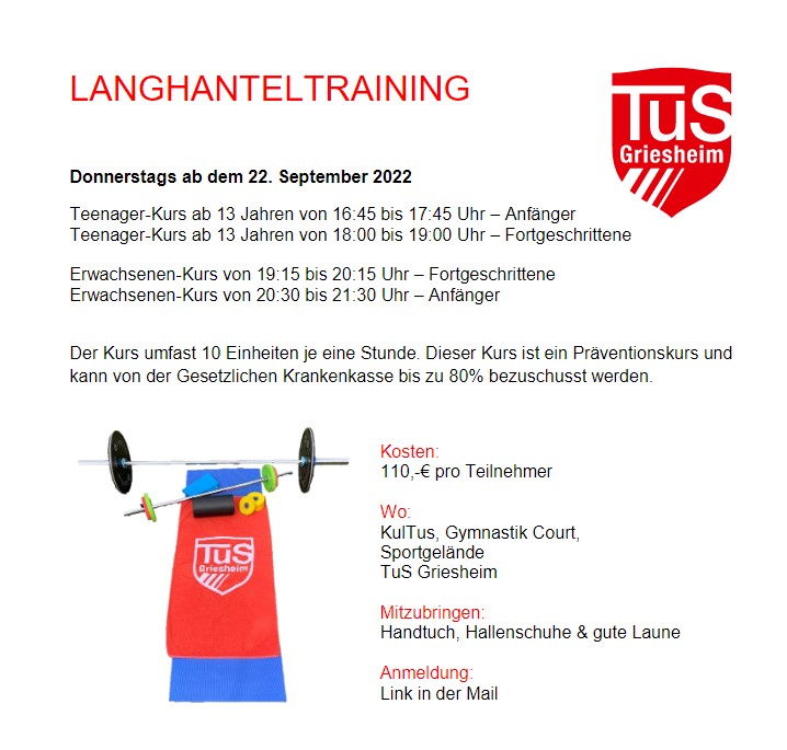 Am morgigen Donnerstag, 22.09.2022, starten wir mit einem weiteren neuen Langhantelkurs in Kooperation mit Herrn Stefan Tretner, Dipl.- Sportwissenschaftler.