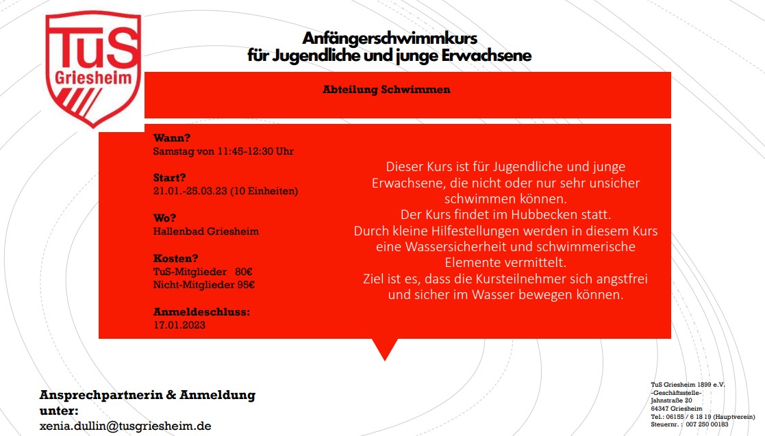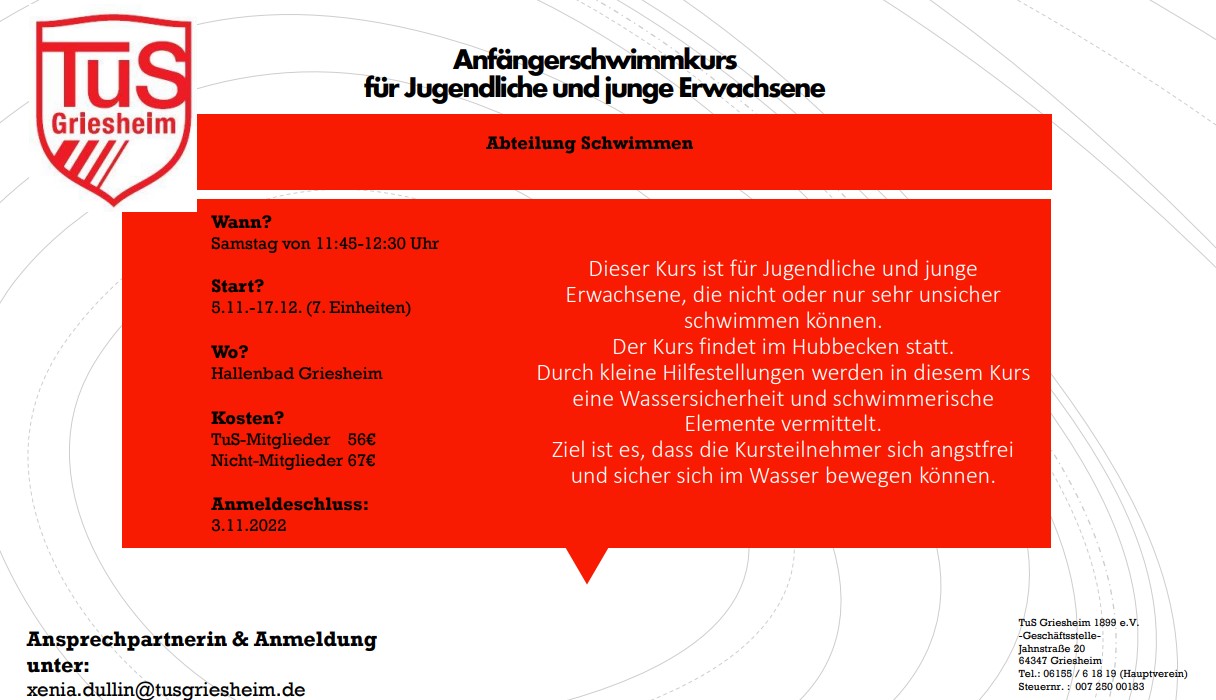 Das Angebot findet in dem Veranstaltungsraum des Kultus des TuS Griesheim statt. Der Zugang erfolgt über den Haupteingang des Kultus "Am Sportfeld 2".