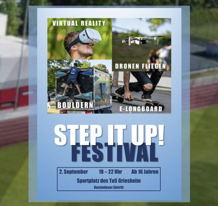 Am 02.09. ab 18 Uhr richtet der TuS mit Hilfe der Sportjugend Hessen das Festival "Step It Up" aus. Diese Veranstaltung richtet sich zur Abwechslung mal an junge Erwachsene.