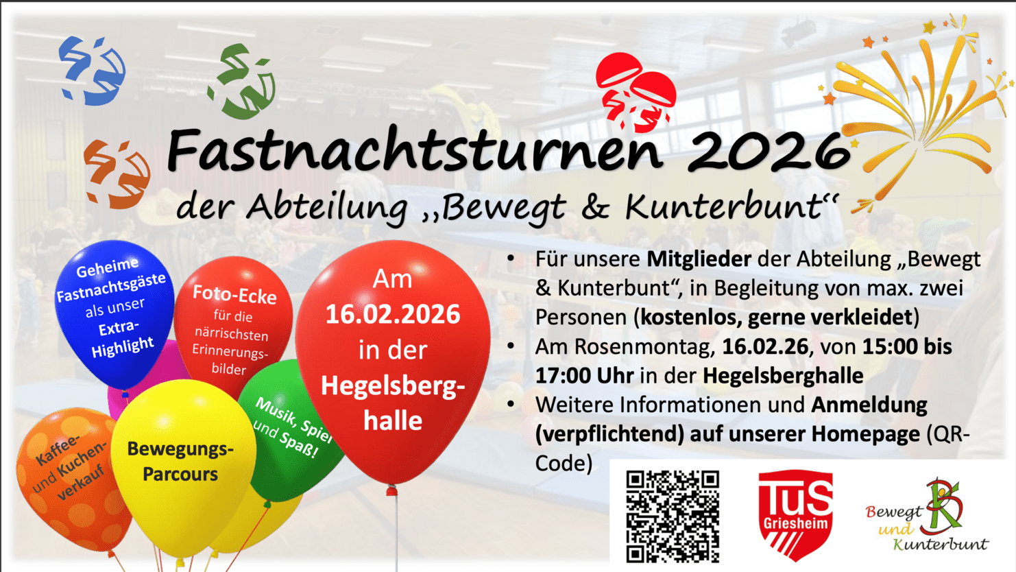 Am Rosenmontag, 16.02.2026, wird es närrisch, bunt und bewegt in der Hegelsberghalle, denn wir laden unsere jüngsten Mitglieder herzlich zum Fastnachtsturnen ein! Die Veranstaltung findet von 15:00 bis 17:00 Uhr statt, der Bewegungs-Parcours wird pünktlich um 15:00 Uhr eröffnet. Bitte planen Sie Ihre Ankunft entsprechend.